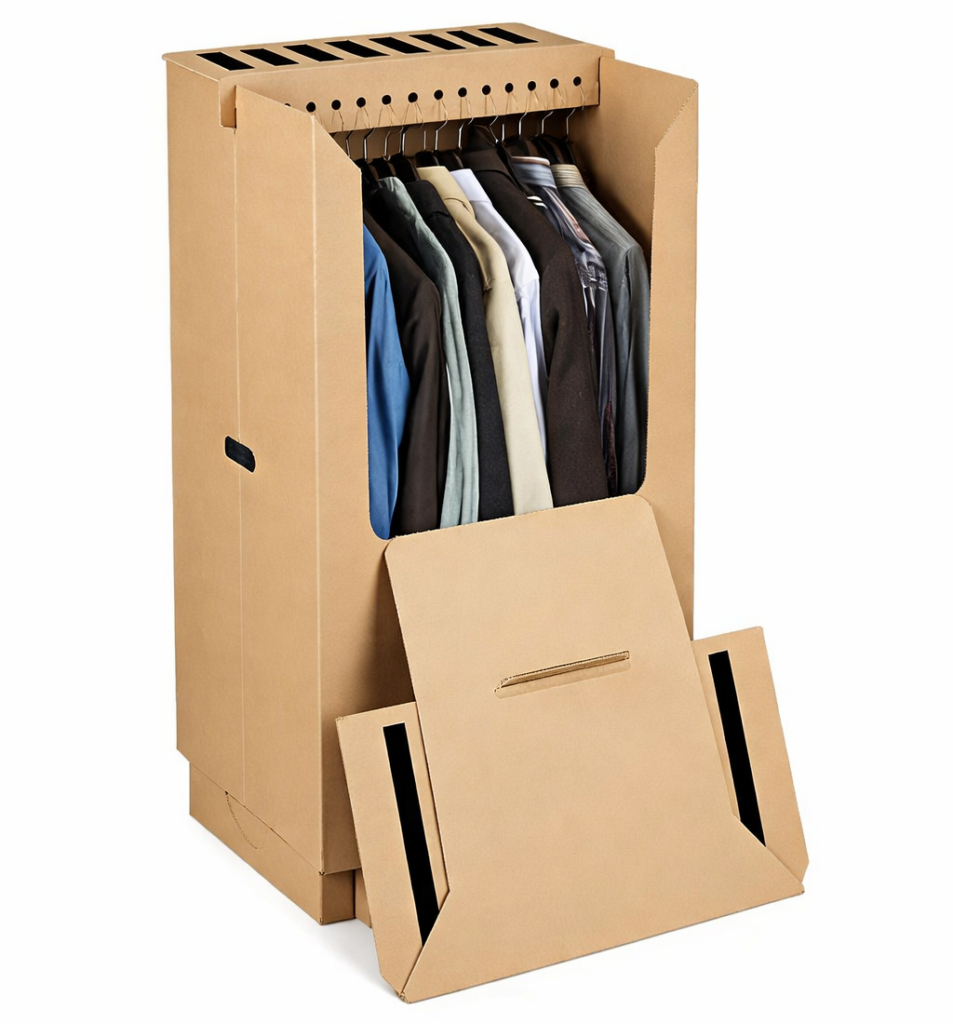 Kleiderkartons verfügen über eine Stange, um Kleidung aufzuhängen. Damit kann sie knitterfrei und bequem transportiert werden.